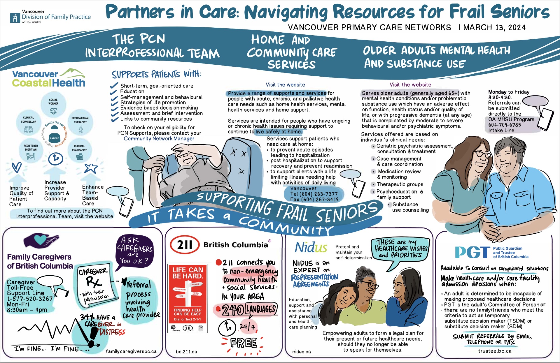 In March of 2024, the Vancouver Divisions Seniors and Frail Elder Committee partnered with the Vancouver Primary Care Networks to deliver an information session for Primary Care Providers to share valuable information to help them support their frail senior patients. 81 Primary Care Providers attended the session, which was a follow up from the PCN Engagement Forums held in November of 2023, where we engaged providers on the barriers they experience when trying to support their frail senior patients to live well in the community. At the information session, attendees received presentations from the PCN Interprofessional Team and Vancouver Coastal Health Vancouver Community Services, as well as several Community Partner Organizations, on the services they provide to support frail seniors living in the community. Case studies were used to support more practical takeaways.