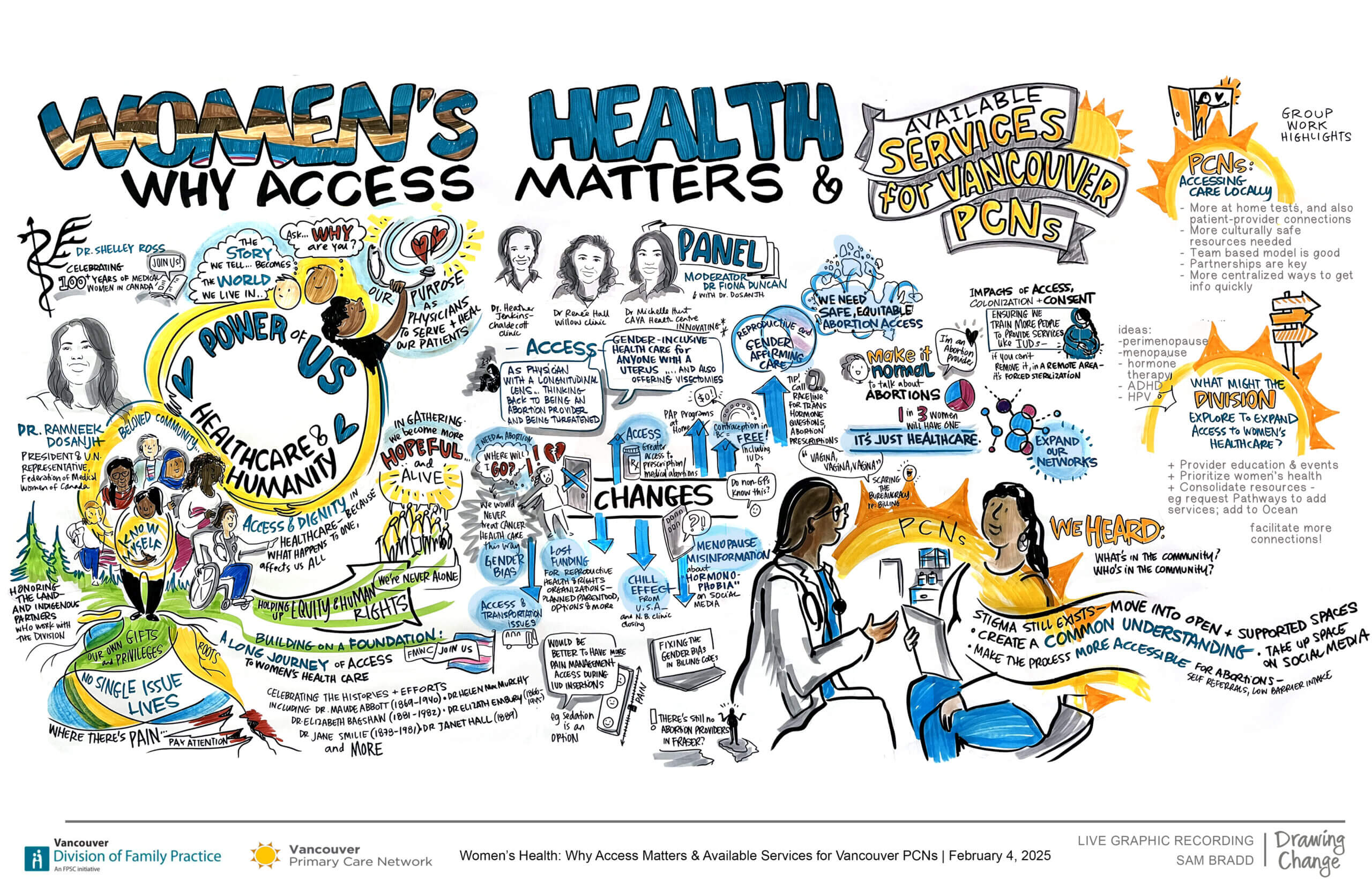The second half of the evening involved table discussions which reflected on the previous presentation and panel discussions, explored the level of comfort for providers in knowing what women's health supports are available, and how to access them, as well as what possible supports the Vancouver Division could provide to advance access to women's healthcare. The event was captured by a graphic facilitator who created the image below.